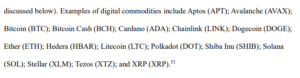 La guía no establece una clasificación completa activo por activo, pero sí ofrece ejemplos concretos dentro de las distintas categorías que reconoce la SEC. Entre ellos se incluyen proyectos como aptos (APT), avalanche (AVAX), bitcoin cash (BCH), cardano (ADA), chainlink (LINK), dogecoin (DOGE), ether (ETH), hedera (HBAR), litecoin (LTC), polkadot (DOT), shiba nu (SHIB), solana (SOL), stellar (XLM), tezos (XTZ) y XRP.
