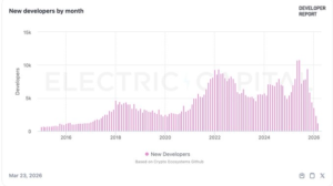 La cantidad de nuevos desarrolladores vinculados a proyectos de criptomonedas cayó alrededor de 1.900, niveles no vistos desde 2017, según datos de la web Develorper Report. No obstante, Lorenzo Valente, director de investigación de ARK Invest, planteó que esta métrica podría perder relevancia rápidamente producto del uso de la inteligencia artificial (IA).