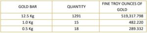 La estructura incluía lingotes de diferentes tamaños: 1.291 unidades de 12,5 kg (519.317 onzas troy), 15 de 1 kg (482.220 onzas troy) y 18 de 0,5 kg (289.332 onzas troy), como se aprecia en la siguiente tabla. La onza troy es la unidad de peso estándar internacional para metales preciosos como el oro y se utiliza para garantizar precisión en las mediciones globales.